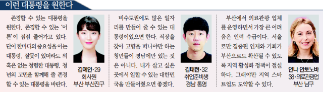 존경할 수 있는 대통령을 원한다. 존경할 수 있는 ‘어른’이 점점 줄어가고 있다. 단어 한마디의 중요성을 아는 대통령, 잘못이 있더라도 의혹은 없는 청렴한 대통령, 청년의 고민을 함께해 줄 존경할 수 있는 대통령을 바란다.