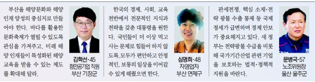 부산을 해양문화와 해양 인재 양성의 중심지로 만들어야 한다. 바다를 활용한 문화축제가 열릴 수 있도록 관심을 가져주고, 미래 해양 인재들이 특성화된 해양 교육을 받을 수 있는 제도를 확대해 달라.