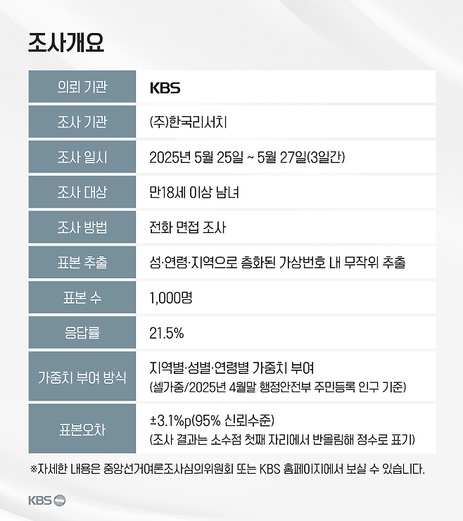 이번 여론조사는 KBS가 한국리서치에 의뢰해 지난 25일부터 27일까지 사흘간 전국 만 18세 이상 남녀 1천 명을 전화 면접 조사했고, 표본오차는 95% 신뢰 수준에 ±3.1%포인트입니다.