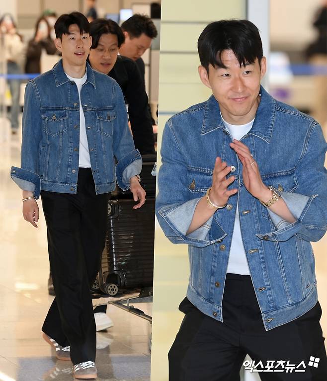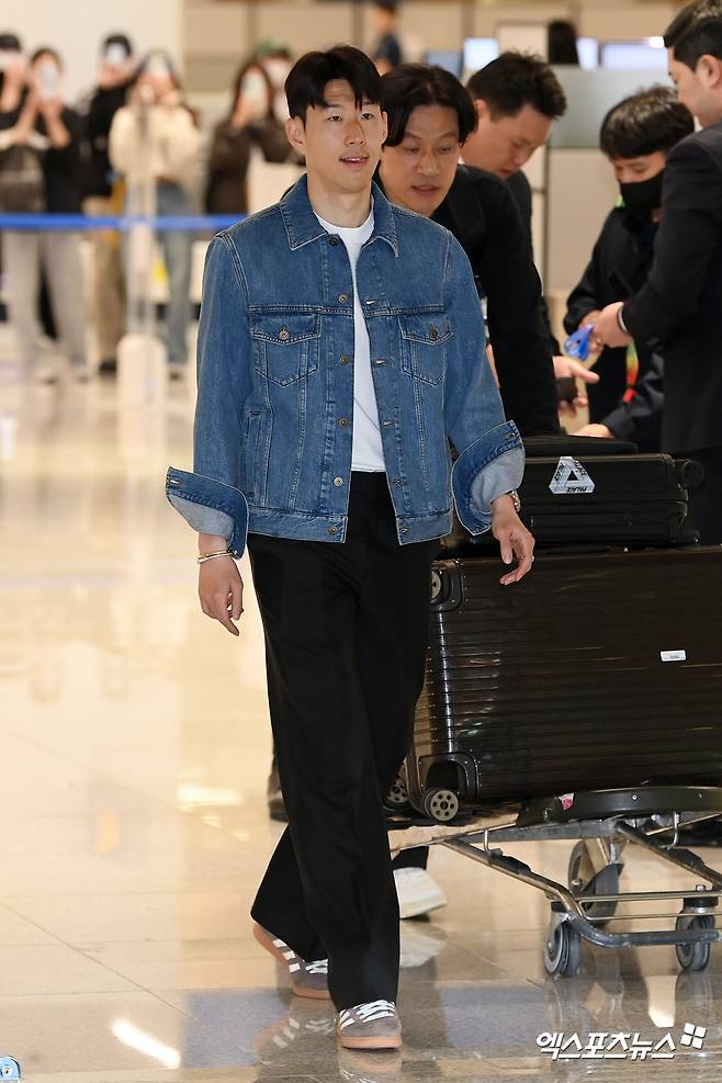 이날 뜨거운 환호를 받으며 입국장을 나선 손흥민은 패션의 공식과도 같은 하얀색 티셔츠에 검정 슬랙스와 청재킷을 매치한 공항패션을 선보였다.