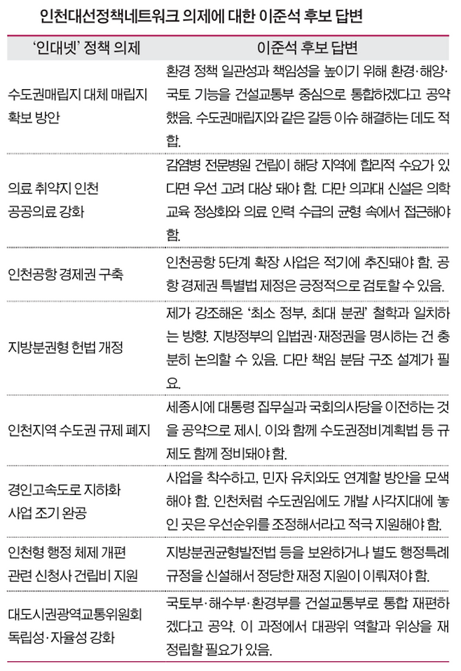 이준석 개혁신당 대선 후보가 수도권매립지 대체 매립지 확보와 공공의료 확충 등 인천지역 현안을 적극적으로 해결하겠다는 의견을 피력했다. 이 후보는 '2025 인천대선정책네트워크(인대넷)'가 제안한 8개 대선 정책 의제에 명확한 답변을 내놨다.<표 참조>