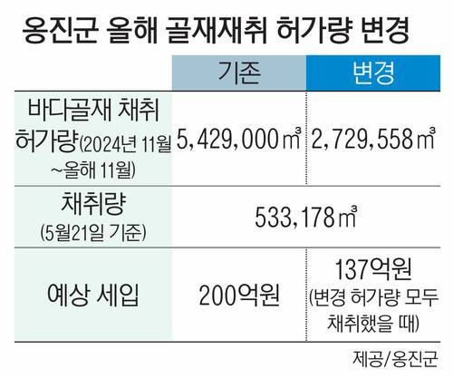 당초 옹진군은 올해 본예산에서 바닷모래 점·사용료 세입을 200억원으로 추산했다. 건설경기 악화를 고려해 작년보다 보수적으로 예산을 편성한 것이다. 하지만 이번에 축소된 골재 채취 허가량(272만9천558㎥)으로 옹진군이 예상한 점·사용료 세입은 137억원으로 쪼그라들었다. → 표 참조