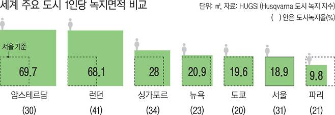 하지만 시민 1명이 누릴 수 있는 녹지면적은 전 세계 주요 도시와 비교했을 때 넓지 않다. 서울시민 1인당 녹지면적은 18.9㎡에 불과하다. 서울보다 도시녹지율이 낮은 뉴욕, 도쿄, 암스테르담보다도 작다. 암스테르담 시민 1명이 누리는 녹지면적은 69.7㎡에 달한다.