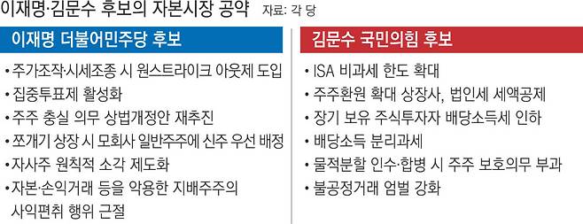 이 후보는 이사의 충실의무 대상에 주주를 포함하는 상법 개정과 자사주 소각 제도화를 공약으로 내세웠다. 김 후보는 배당소득 분리과세와 물적분할 등에 대한 주주 보호의무 부과를 공약으로 냈다.