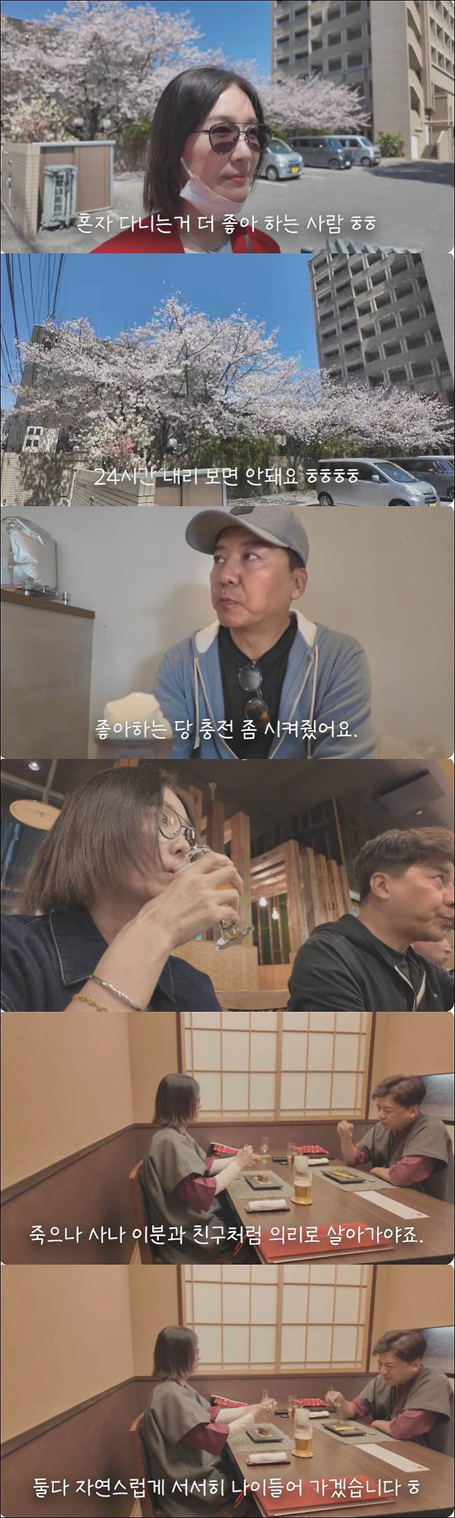 하지만 저녁엔 함께 자주 가는 오징어횟집에 가서 오징어회를 먹었다. 다음날 근교 료칸으로 가서 휴식을 제대로 즐긴 손지창 오연수 부부. 오연수는 료칸 근처 산책을 하며 꽃 구경에 빠졌다. 오연수는 "옛날엔 꽃 보며 예쁨을 만끽할 여유도 (없었다.) 애 키우며 일하며 삶이 바빴다"며 여유롭게 산책했다.