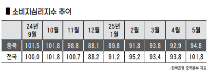 충북의 소비심리지수는 지난해 11월(98.8)부터 올해 1월(89.8)까지 100 이하로 내려앉았다. 이후 2월부터 2개월째 오름세를 보이고 있으나 여전히 기준값 100 이하를 기록했다.