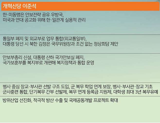 개혁신당 이 후보도 남북관계와 관련한 공약을 10대 공약에 담지 않았다. 정부조직 개편의 하나로 통일부를 폐지하고 외교부로 업무를 통합해 외교통일부로 조직을 통폐합한다고만 했다. 다만 이 후보는 지난달 28일 서울외신기자클럽 간담회에서 “대북정책에 있어 상호주의 원칙을 분명히 하면서도 실용적이고 유연한 접근법을 견지해 지속가능한 평화와 안정을 실현하는 데 주력할 것”이라며 “대통령 임기 개시와 동시에 김정은 국무위원장과의 조건 없는 정상회담을 제안해 대화의 문을 과감히 열겠다”고 기염을 토했다.