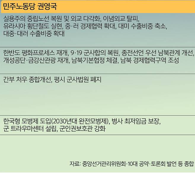 민주노동당 권영국 후보는 ‘윤석열정부가 무너뜨린 중립노선 및 외교 다각화’를 내세웠다. 권 후보는 유라시아 횡단철도 실현, 러시아 북극항로 개척, 6자회담 등을 강조하며 대미 수출 비중 축소, 대중·대러 수출 비중 확대를 공약했다. 한 외교안보 전문가는 “후보자의 분명한 철학에 기반을 둔 정책이지만 러시아·우크라이나의 전쟁이나 미국 중심 국제질서 재편 등 냉철한 현실정치에 맞는 로드맵이 필요하다”고 지적했다.