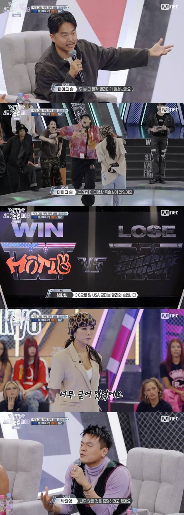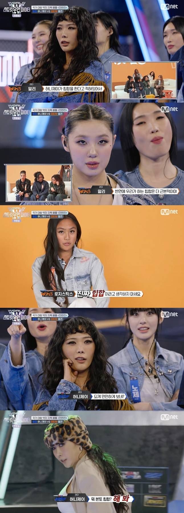 이날 국가 대항 약자 지목 배틀의 첫 번째로는 '범접' 크루의 허니제이가 '모티브' 크루의 말리를 지목했다.