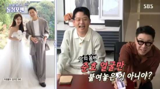 이상민은 모바일 청첩장 속 사진을 보면서 "준호는 다른 사람 몸에 얼굴 합성해 놓은 거 아냐?"라고 했고, 탁재훈 역시 "이거 첫번째 결혼사진이지? 너 말랐을 때"라고 장난을 쳤다.