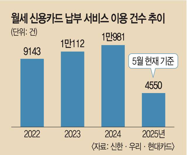 27일 월세 신용카드 납부 서비스를 제공하는 신한 현대 우리카드의 서비스 이용 건수를 보면 2022년 9143건, 2023년 1만112건, 2024년 1만981건이며, 올해는 지난 5월 기준 4550건이다. 증가 추세지만 2022년 대비 2023년 10.6% 늘었던 것과 비교해 2024년에는 전년 대비 8.59% 늘어 증가 폭이 소폭 감소했다.