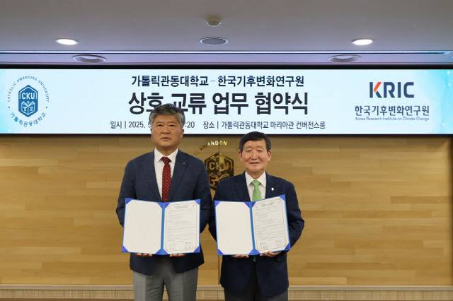 한국기후변화연구원(원장 김동일)과 가톨릭관동대학교(총장 김용승)는 27일 가톨릭관동대학교 컨버전스룸에서 지역 탄소중립 기반 조성을 위한 협약을 체결했다.