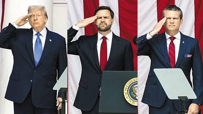 도널드 트럼프 미국 대통령과 J D 밴스 부통령, 피트 헤그세스 국방 장관은 메모리얼 데이(현충일)였던 지난 26일 전몰장병들이 잠든 버지니아주 알링턴 국립묘지를 함께 방문해 방문객들을 향해 거수경례를 했다.