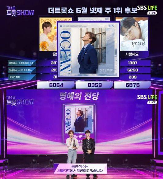 지난 26일 밤 8시 방송된 SBS Life ‘더 트롯쇼’에서는 안성훈의 ‘사랑해요’, 박서진 ‘꿀팁’, 박지현 ‘우리는 된다니까’가 5월 넷째 주 1위 후보에 올랐다. 박지현은 ‘우리는 된다니까’로 총 8359점을 받으며 5월 넷째 주 1위를 차지했다.
