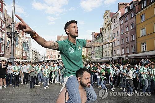 Real Betis fans cheer while gathering in the old city district ahead of the Europa Conference League final soccer match between Real Betis and Chelsea in Wroclaw, Poland, Tuesday, May 27, 2025. (AP Photo/ Czarek Sokolowski)