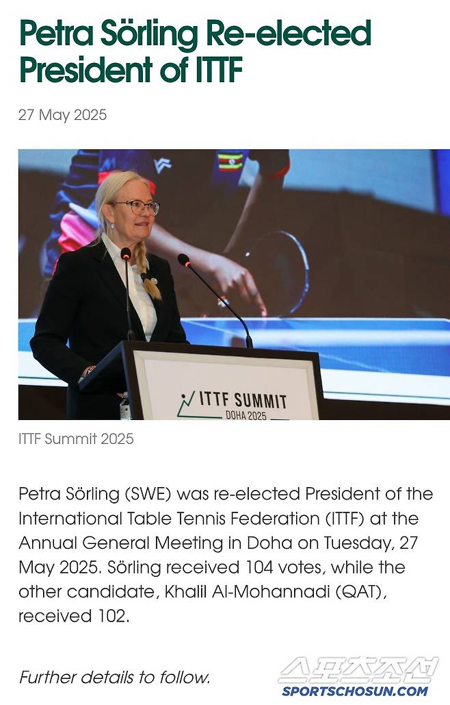 27~28일(한국시각) 세계탁구선수권 종료 직후 카타르 도하에서 개최된 ITTF 연례총회에선 신임 회장, 부회장 선거가 예정돼 있었다. 페트라 쇠링 ITTF 회장의 4년 임기가 종료됨에 따라 새 회장과 집행부를 꾸리는 선거로 쇠링 현 회장이 연임에 도전한 가운데 카릴 알 모한나디 ITTF 부회장 겸 아시아탁구연맹 회장(카타르), 모하메드 엘 하센 아흐메드 살렘 모리타니탁구협회장이 출마했다.