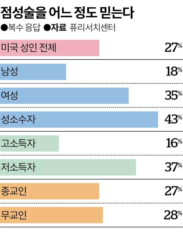 미국인 10명 중 세 명은 1년에 최소 1번 이상 점성술사나 점쟁이를 찾는 것으로 나타났다. 특히 여성일수록, 성소수자일수록 이런 경향은 더 컸다.
