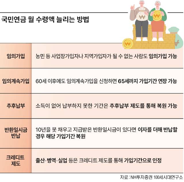 가입기간을 늘리는 방법은 ▲임의가입 ▲임의계속가입 ▲추후납부 ▲반환일시금 반납 ▲크레디트 제도 등으로 다양하다. 사업장가입자가 될 수 없는 농민도 임의가입을 통해 연금에 가입할 수 있으며, 60세 이후에도 임의계속가입을 신청하면 65세까지 연장 가능하다. 납부하지 못한 기간은 추후납부 제도를 통해 복원할 수 있다. 10년을 못 채우고 지급받은 반환일시금이 있다면 이자를 더해 반납하면 해당 가입기간이 복원된다. 출산·병역·실업 등은 크레디트 제도를 통해 가입기간으로 인정받을 수 있다. 소득이 있는 고령자라면 연금 수령을 1∼5년 미뤄 수령액을 최대 36%까지 늘릴 수 있는 연기연금도 생각해볼 만하다.