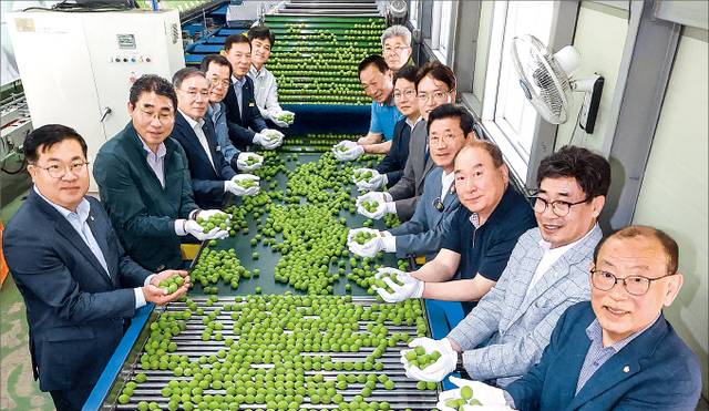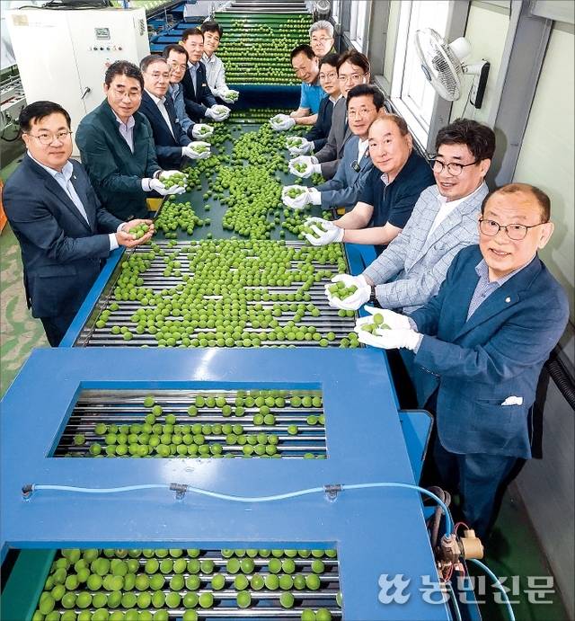 본격적인 매실 수확철을 맞아 전남 광양시농협조합공동사업법인이 26일 광양 다압농협 매실 선별장에서 초출하식을 열었다. 정인화 광양시장(오른쪽 줄 앞에서 네번째부터), 이광일 전남농협본부장, 김종연 다압농협 조합장(〃맨 끝), 허순구 광양시농협조공법인 이사회 의장(광양농협 조합장, 왼쪽 줄 앞에서 두번째)과 관계자들이 초출하식을 축하하고 있다.