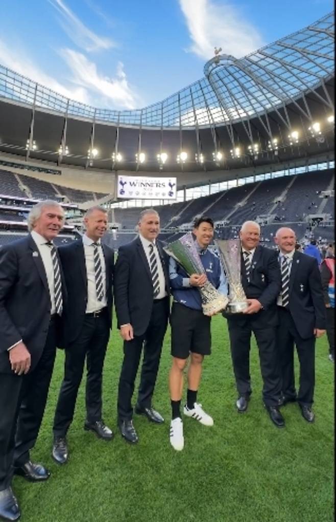 손흥민을 반겨준 이들은 일명 '토전드(토트넘 레전드)'들이었다. 스티브 페리맨, 마틴 치버스, 오스발도 아르딜레스 등이 트로피를 든 손흥민을 반겼고 기념 촬영도 했다.