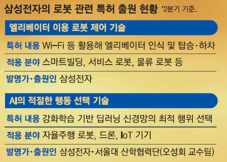 미국 특허청은 26일(현지시간) “삼성전자가 2분기 들어 두 건의 특허를 미국에 출원했다”며 “한 건은 로봇이 엘리베이터를 인식하고 승하차하는 방법이고, 또 다른 한 건은 인공지능 로봇이 미래 결과를 예측하며 최적의 결정을 내리는 방법”이라고 밝혔다.