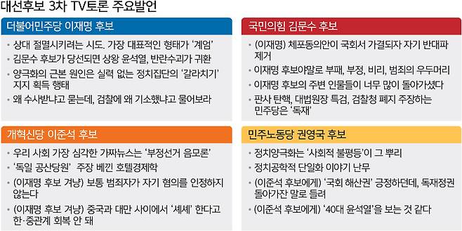 김문수·이준석 ‘방탄입법’ ‘호텔경제학’ 공세… 이재명 ‘계엄’ 거론해 반격 [6·3 대선]