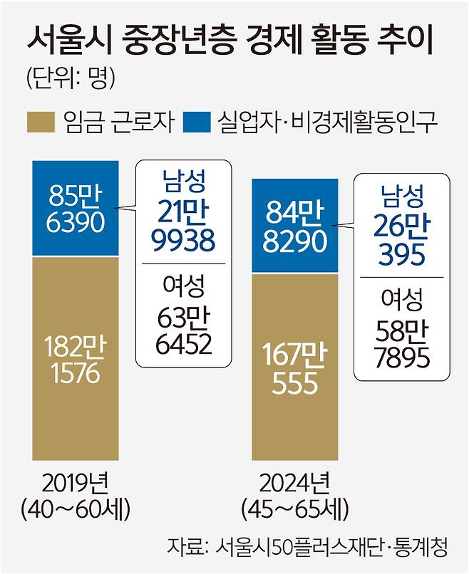 특히 지난해 서울 중장년 인구가 약 298만명으로, 2019년(약 321만명)보다 23만명 정도 줄었는데 남성의 경우엔 여성과 달리 실업자와 비경제활동인구가 되레 약 4만명 늘었다.