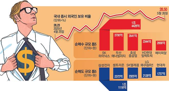 다만 이달 들어 외국인은 국내 증시에서 다시 매집하는 추세를 나타내고 있다. 지난 3월 말 외국인의 국내 증시 보유 비율은 29.34%로 정점을 찍었다가 4월 말 28.23%까지 내려왔는데, 이달 들어 다시 상승하기 시작해 26일 기준 28.5%까지 올라온 상태다.