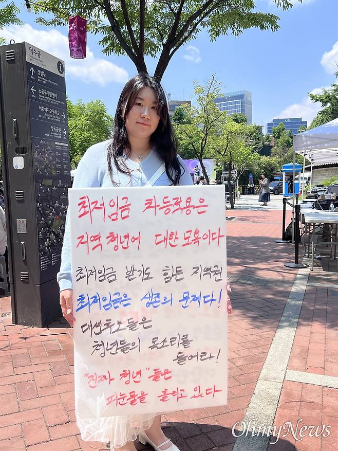 김씨는 지난 25일 이 후보의 공약을 비판하기 위해 대구에서부터 "최저임금 차등적용은 지역 청년에 대한 모욕이다. 최저임금 받기도 힘든 지역권 최저임금은 생존의 문제다! 대선 후보들은 청년들의 목소리를 들어라! '진짜 청년'들은 피눈물 흘리고 있다"고 적힌 손팻말을 들고 오전 6시 기차를 타고 서울의 한 포럼에 참석하기도 했다.