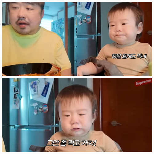 결국 짬뽕과 만두가 사라지자 현조는 조용히 응가 준비에 돌입했다. 강재준은 “어? 똥 싸고 있어? 아빠 밥 먹는데 응아를 하면 어떡해~”라며 당황한 표정을 감추지 못했다. 이어진 ‘아빠의 말투+아들의 민망 표정’ 조합은 현실 부자의 일상을 리얼하게 그려냈다.
