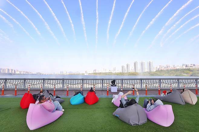 | ▲ 4일 오후 서울 서초구 잠수교에서 열린 '2025 차 없는 잠수교 뚜벅뚜벅 축제'를 찾은 시민들이 휴식을 취하고 있다. |