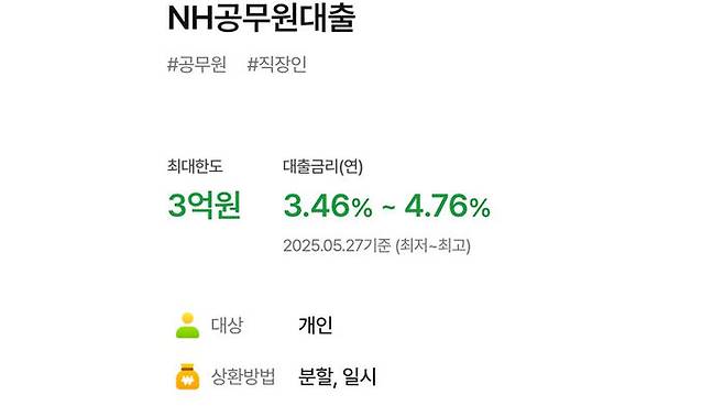이 상품은 3개월 이상 근무한 공무원이 비대면으로 가입할 수 있는 대출 상품으로, 대출 금리는 전날 기준 연 3.46~4.76% 수준입니다.