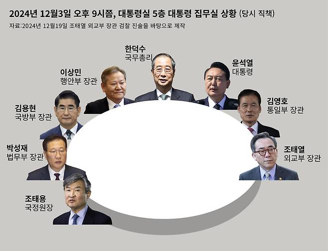 오후 8시55분쯤 두 사람이 대통령 집무실에 들어갔을 땐 윤석열과 함께 김용현 국방부 장관, 박성재 법무부 장관, 이상민 행정안전부 장관이 있었다. 이상민 장관은 다른 국무위원들과 달리 대접견실을 들르지 않고, 곧장 대통령 집무실로 향한 터였다. ‘1차 호출 멤버(한덕수, 박성재, 조태열, 이상민, 조태용)’ 중 마지막으로 조태열 장관, 조태용 국정원장이 연달아 대통령 집무실에 도착했다. 윤석열은 “비상계엄을 선포하려고 한다”라면서 ‘외교부 장관’ ‘재외공관’이라는 단어가 포함된 문건을 조태열 장관에게 건넸다. 한덕수 총리는 “외교부 장관은 어떻게 생각하느냐”라고 물었다. 조태열 장관이 “외교적 영향뿐만 아니라 70여 년간 대한민국이 쌓아온 모든 성취를 한꺼번에 무너뜨릴 만큼 엄청난 파장을 일으킬 수 있는 문제이니 재고해주십시오”라고 반대하자, 윤석열이 격노했다.