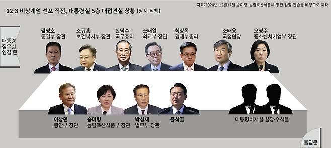 30여 분 뒤면 윤석열이 비상계엄을 선포하고, 계엄군이 출동하는 상황이었다. 그쯤 윤석열이 대통령 집무실에서 대접견실과 연결된 쪽문으로 나와 한덕수 총리를 불렀다. 한 총리가 혼자 집무실로 들어가 “국무회의를 열어야 한다. 정족수를 맞춰야 한다”라고 하자(한덕수 총리는 이때 윤석열을 만류하며 “다른 국무위원의 말도 들어보시라”고 했다고 주장한다), 윤석열은 곧바로 대통령 집무실에 있던 김정환 수행실장에게 추가 지시를 내렸다. 윤석열은 “빨리 (이 사람들을) 불러라”라면서 ‘최상목, 송미령, 조규홍, 오영주, 박상우, 안덕근’ 등 6명 장관 명단을 추가로 읊었다.