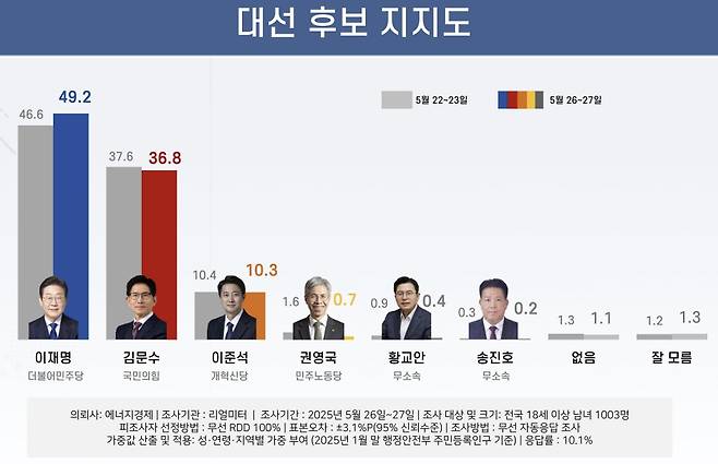 리얼미터가 에너지경제신문 의뢰로 지난 26~27일 전국 1003명을 대상으로 차기 대선주자 적합도를 조사(95% 신뢰수준에 표본오차 ±3.1% 포인트)한 결과, 이재명 후보는 49.2%, 김문수 국민의힘 후보는 36.8%, 이준석 개혁신당 10.3%의 지지율을 기록했다.