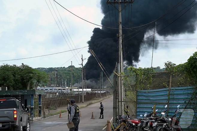 (에스메랄다스 AFP=뉴스1) 우동명 기자 = 26일 (현지시간) 에콰도르 에스메랄다스에 있는 정유 공장에서 화재가 발생해 검은 연기가 솟아 오르고 있다. 2025.05.28