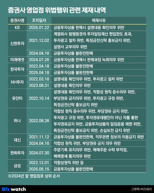 증권사들이 영업점에서 발생한 사고로 제재를 받는 사례는 심심치 않게 발생하고 있다. 최근 5년 동안 금융당국이 증권사에 내린 제재 내역을 살펴본 결과, 점포 수 상위 10개사 모두 지점 영업 과정에서 자본시장법 위반이 적발돼 제재를 받은 이력이 있었다.