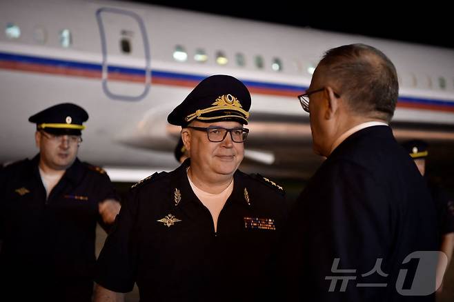 (평양 AFP=뉴스1) 우동명 기자 = 비탈리 슐리카 러시아 내무성 차관이 26일 (현지시간) 평양 국제 공항에 도착해 환영을 받고 있다. 2025.05.28