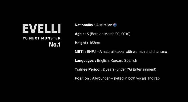 특히 이벨리는 영어, 한국어, 스페인어 등 다양한 언어를 구사하며 글로벌 역량까지 겸비했다. 보컬, 랩, 퍼포먼스, 언어까지 모두 아우르는 ‘올라운더’라는 점에서 YG가 준비한 전략형 멤버임이 분명하다.