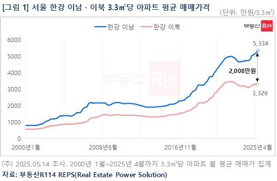 부동산R114은 서울 아파트 월 평균 매매가격을 조사한 결과, 4월 한강 이남 지역 11개구 아파트의 3.3㎡당 평균 매매가는 5334만원으로 한강 이북 14개구 평당가(3326만원)보다 2008만원(60.4%) 높았다고 27일 밝혔다.