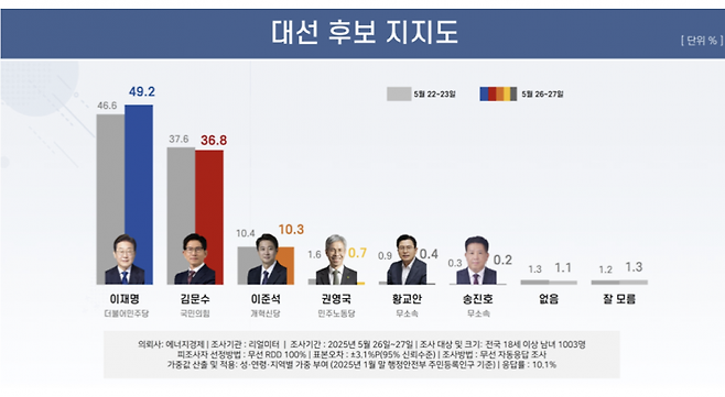 28일 여론조사업체 리얼미터가 공개한 여론조사(에너지경제신문 의뢰로 26~27일 이틀간 전국 18세 이상 1003명을 대상으로 무선 전화 ARS 방식으로 조사, 응답률은 10.1%, 표본오차는 95% 신뢰수준에서 ±3.1%포인트)에 따르면 이재명 후보 지지율은 지난 조사(22~23일 조사)보다 2.6%포인트 오른 49.2%로 조사됐다. 김문수 후보는 0.8%포인트 하락한 36.8%다. 이준석 개혁신당 대선후보는 지지율이 0.1%포인트 내린 10.3%로 나타났다.