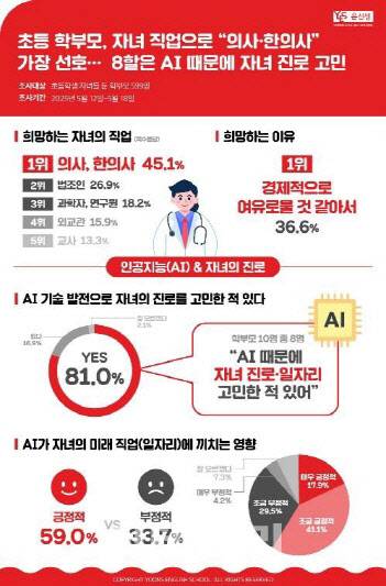 학부모 10명 중 8명(81%)은 인공지능(AI) 기술 발전 때문에 자녀 진로를 고민한 적이 있다고 응답했다. 특히 이들 중 71.3%는 ‘AI 기술 발전에 맞춰 자녀 진로를 변경할 계획’이라고 답했다. AI가 자녀의 미래 직업·일자리에 끼칠 영향에 대해서는 긍정적 영향을 예상한 학부모가 59%, 부정적 영향을 끼칠 것이라 예상한 학부모가 33.7%였다.