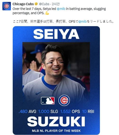메이저리그 사무국은 28일(이하 한국시간) 공식 SNS를 통해 '이주의 선수(Players of the Week)' 명단을 발표했다. 스즈키는 지난 한 주 동안 타율 0.480(25타수 12안타) 3홈런 10타점 9득점 OPS 1.552로 맹활약했다.
