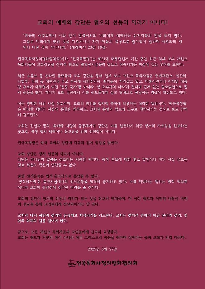 전국목회자정의평화협의회(아래 목정평)는 27일 '교회의 예배와 강단은 혐오와 선동의 자리가 아니다'라는 성명을 통해 "최근 일부 보수 개신교 목회자들이 교회강단을 정치적 혐오와 불법 선거운동의 장으로 전락시키는 현실에 깊은 우려를 표한다"고 입장을 밝혔다.