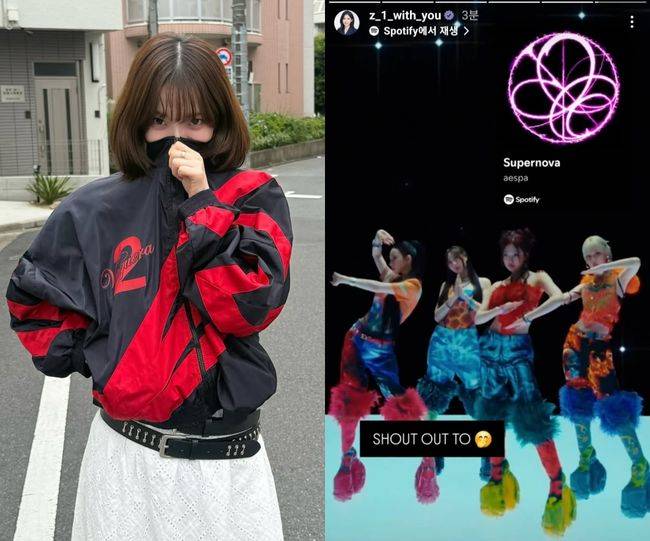 지난 27일 카리나는 개인 계정을 통해 일본에서 촬영한 일상사진을 공개하며 장미꽃 이모티콘을 함께 게재했다. 공개된 사진 속에서 카리나는 빨간색 숫자로 ‘2’가 프린트된 점퍼를 입고 있는 모습.
