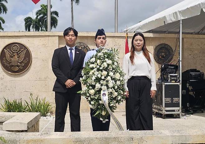 [서울=뉴시스] 국제청소년연합 산하 굿뉴스코 해외봉사단 단원들이 26일(현지 시간) 미국령 푸에르토리코 바야몬시의 국립묘지에서 대한민국을 대표해 헌화하고 있다. (사진=IYF푸에르토리코 제공) 2025.05.28. photo@newsis.com *재판매 및 DB 금지
