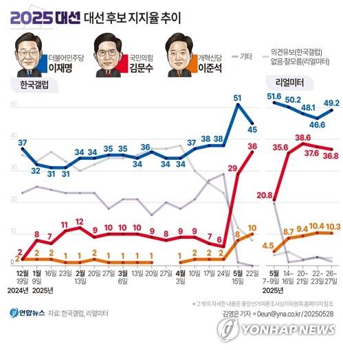 (서울=연합뉴스) 김영신 기자 = 제21대 대선이 엿새 앞으로 다가온 28일 더불어민주당 이재명 후보가 49.2%, 국민의힘 김문수 후보는 36.8%, 개혁신당 이준석 후보는 10.3% 지지율을 기록했다는 여론조사 결과가 나왔다.