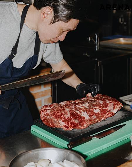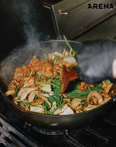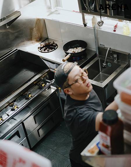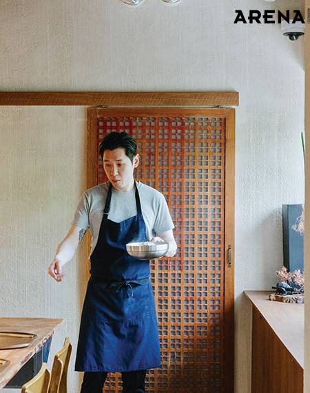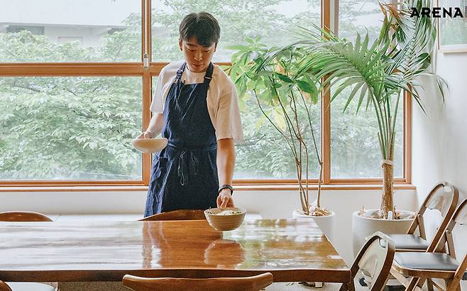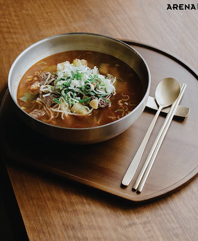 최지형 셰프의 ‘킥’은 고추기름이었다. 손님상에 내고 남은 자투리를 활용해 고추기름을 내면, 남은 재료도 사용할 수 있고 맛도 한층 깊어진다. 등심 덧살과 무를 먹기 좋은 크기로 썰어 달달 볶은 뒤, 센불에 콩나물과 제철 대파를 육수와 함께 넣어 끓이면 금세 완성된다. 최지형 셰프는 20년 동안 요리를 하면서 자연스레 ‘1일 1식’을 하게 됐다고 한다. “스페인에 페란 아드리아라는 세계적인 셰프가 있어요. 그분은 <패밀리 밀>이라는 책까지 냈어요. 스태프 밀도 결국은 밀이잖아요. 이것도 트레이닝이거든요. 바쁜 와중에도 맛있는 요리를 만들고 즐길 수 있어야죠.” 최지형 셰프가 생각하는 ‘좋은 스태프 밀’은 ‘밥 한공기 더 먹게 되는 식사’라고.