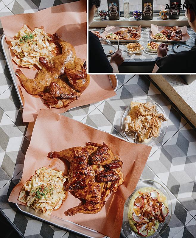 이날 벤디또 직원 식사는 신메뉴 테스트로 진행됐다. 오크통닭은 참나무에 훈연한 치킨에 한국식 고추장 양념을 발라 완성된다. 옆에 놓인 샐러드는 송인욱 수셰프가 최근 필리핀 출장에서 먹었던 샐러드를 나름대로 떠올려가며 완성한 것. 아구아칠레는 ‘남미식 초무침’에 가깝다. 새우는 그릴에 굽고, 세 가지 살사를 버무려 새콤하게 즐긴다. 명태칩스는 명태 껍질을 부각처럼 튀겨 나초와 함께 낸다. 김인혁 셰프는 커다란 손으로 닭 가슴살을 찢으며 말했다. “스태프 밀 만들 때 실력이 많이 늘거든요. 새로운 재료와 레시피를 도전해볼 수 있으니까요.” 벤디또에서는 아무리 바빠도 직원 식사만큼은 같이 만들고 같이 먹는 것이 원칙이라고 한다.