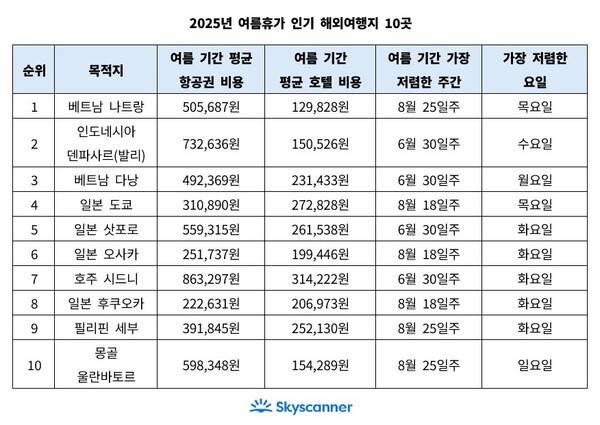 올여름, 가장 합리적인 가격으로 휴가를 떠날 수 없을까? 스카이스캐너가 자체 데이터를 기반으로 한 '더 스마트한 여름휴가 리포트'를 통해, 2025년 여름철 가장 저렴한 항공권 시기와 인기 여행지를 발표했다.